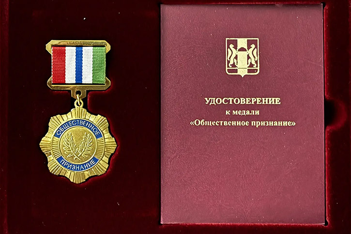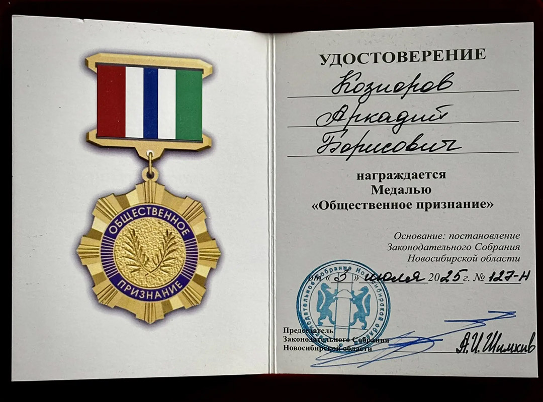 Медаль "Общественное признание" Законодательного Собрания Новосибирской области подчёркивает вклад Аркадия Борисовича Козиорова в развитие культуры и образования, а также признание его заслуг перед обществом.