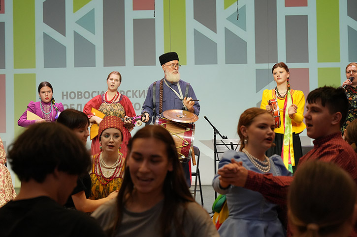 На время Этнотеки концертный зал НОККиИ превращается в большую танцевально-игровую площадку. Участники: школьники профильной смены СТАРТПРОФ, студенты всех отделений колледжа, будущие абитуриенты, выпускники и участники молодежных фольклорных коллективов Новосибирска.