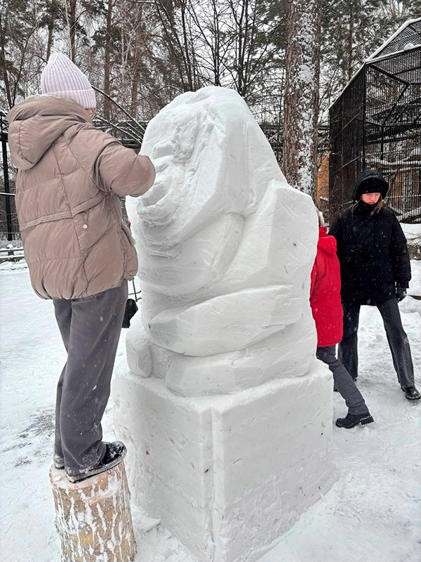Сначала студенты разработали и согласовали макет, а потом превратили снежный куб размером 1×1×1,8 м в профессиональную скульптуру. Это требовало не только творческого видения, но и физической выносливости, и мастерства.