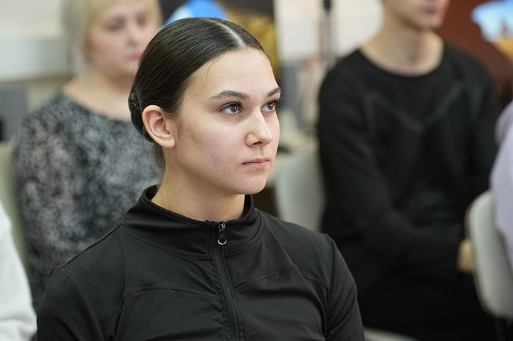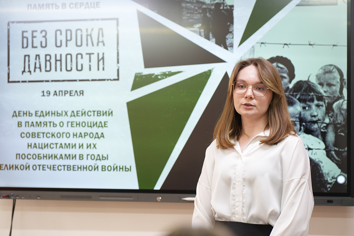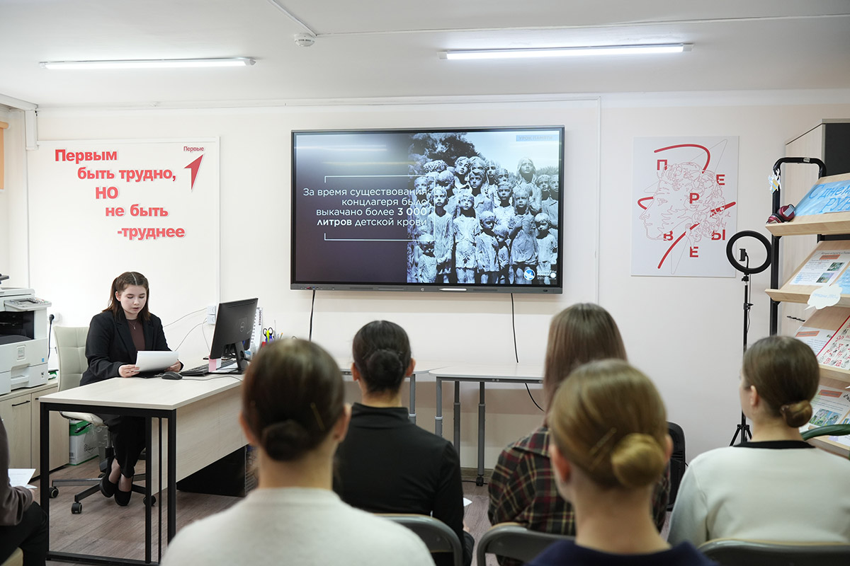О масштабах трагедии, преступлениях нацистов и о том, как важно сохранять историческую правду, со студентами говорили преподаватель истории и обществознания Анна Дмитриевна Быстрова и активистка Всероссийского общественного движения "Волонтёры Победы", студентка 3 курса отделения ДПИ Анастасия Марченко.