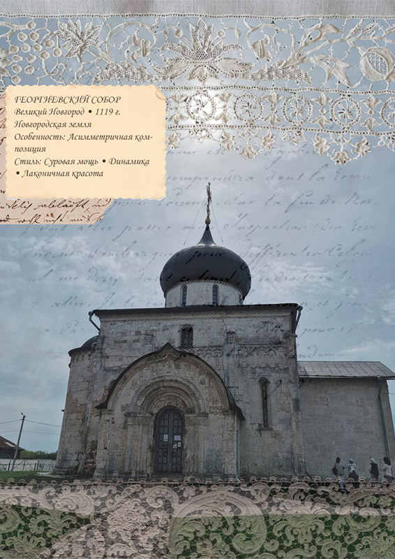 Георгиевский собор Юрьева монастыря (Новгород) - Сила и простота. Возведенный как духовный форпост и усыпальница, этот собор олицетворяет мощь и лаконизм новгородской традиции. Его строгие, монументальные формы, лишенные излишней декоративности, символизируют воинскую доблесть (посвящение Георгию Победоносцу) и суровую, сосредоточенную красоту севера.
