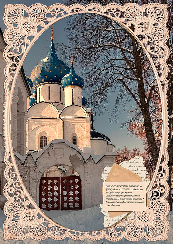Собор Рождества Богородицы (Суздаль) - Государственный идеал. Храм-манифест владимиро-суздальского стиля, в котором политическое величие княжества нашло выражение в белокаменной резьбе и гармоничных пропорциях. Его утонченные рельефы и стройный силуэт говорят о стремлении создать на Руси "Новый Иерусалим" - центр одновременно духовной и светской власти.